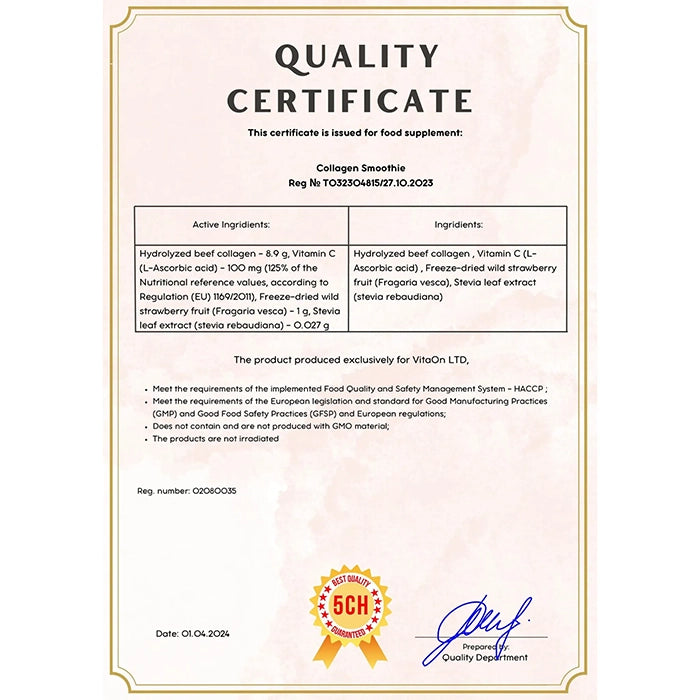 La confianza de nuestros clientes es nuestra principal prioridad. Por eso, nuestro Batido de Colágeno se produce conforme al estándar de Buenas Prácticas de Manufactura (GMP) – el estándar de oro en la industria. Esto garantiza un estricto control en cada etapa – desde la selección de materias primas hasta el producto final. Como garantía adicional de autenticidad y seguridad, el producto está registrado en la Agencia de Seguridad Alimentaria con el número de registro Т032304815.