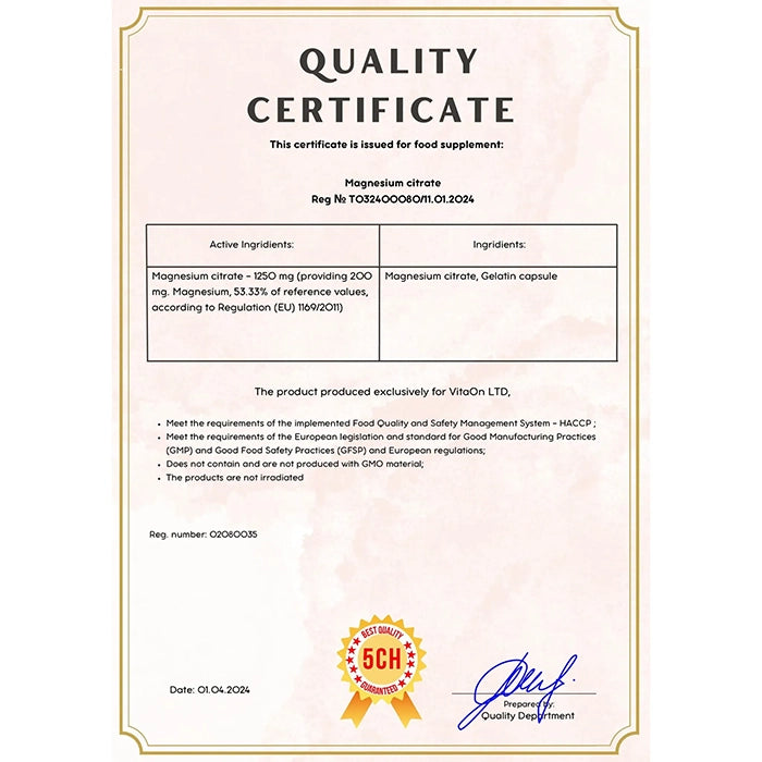 La confianza de nuestros clientes es nuestra prioridad. Por eso, el citrato de magnesio de VitaOn se produce sin comprometer la calidad. Su fabricación se realiza según el estándar de Buenas Prácticas de Manufactura (GMP), el estándar de oro de la industria, que garantiza un control riguroso en cada etapa para asegurar la máxima pureza, seguridad y eficacia. Para total transparencia y garantía de autenticidad, cada producto cuenta con el número de registro T032400080, emitido por la Agencia de Seguridad Alimentaria (BABH).