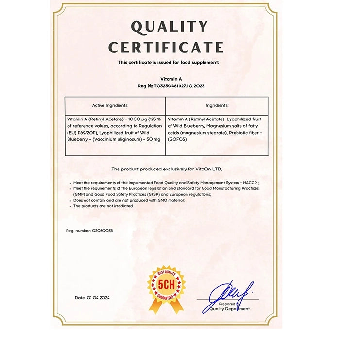 La confianza de nuestros clientes es nuestra principal prioridad. Por ello, nuestra Vitamina A se produce conforme al estándar de Buenas Prácticas de Manufactura (GMP), el estándar de oro en la industria. Esto garantiza un estricto control en cada etapa, desde la selección de materias primas hasta el producto final. Como garantía adicional de autenticidad y seguridad, el producto está registrado en la Agencia de Seguridad Alimentaria (BABH) con número de registro T032304811.